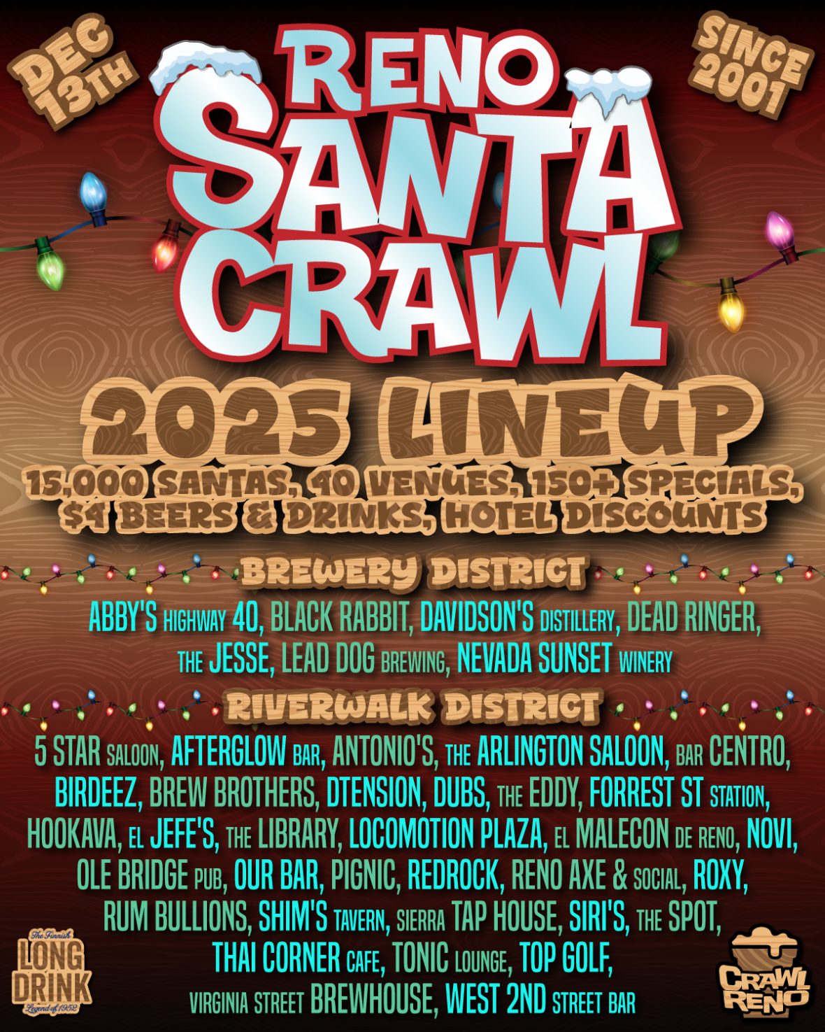 Each year 15-20,000 Santas party together in Reno, NV for this “bucket-list” event enjoying over 150 specials at over 40 venues. Established in 2001, The world-famous Reno Santa Crawl is one of the largest, longest running & best-run events of its kind!